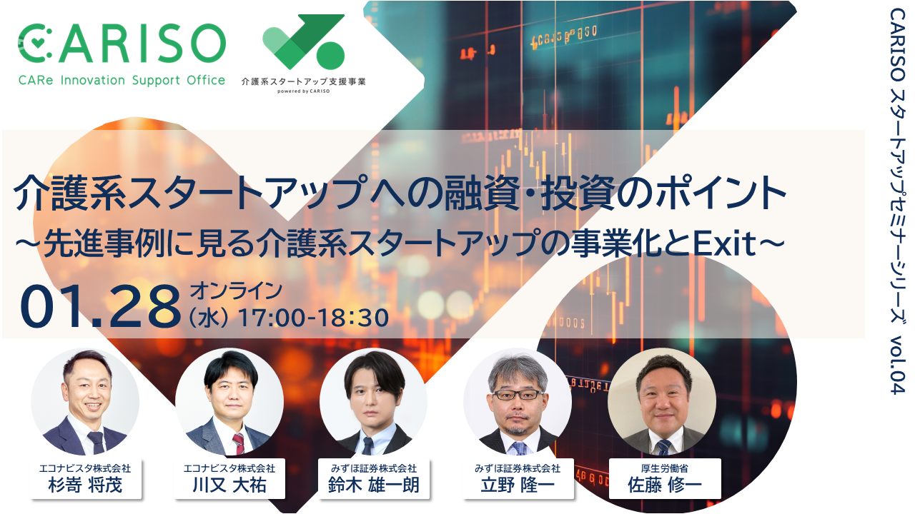 2025.12.12CARISOスタートアップセミナーシリーズ vol.04:介護系スタートアップへの融資・投資のポイント ~先進事例に見る介護系スタートアップの事業化とExit~